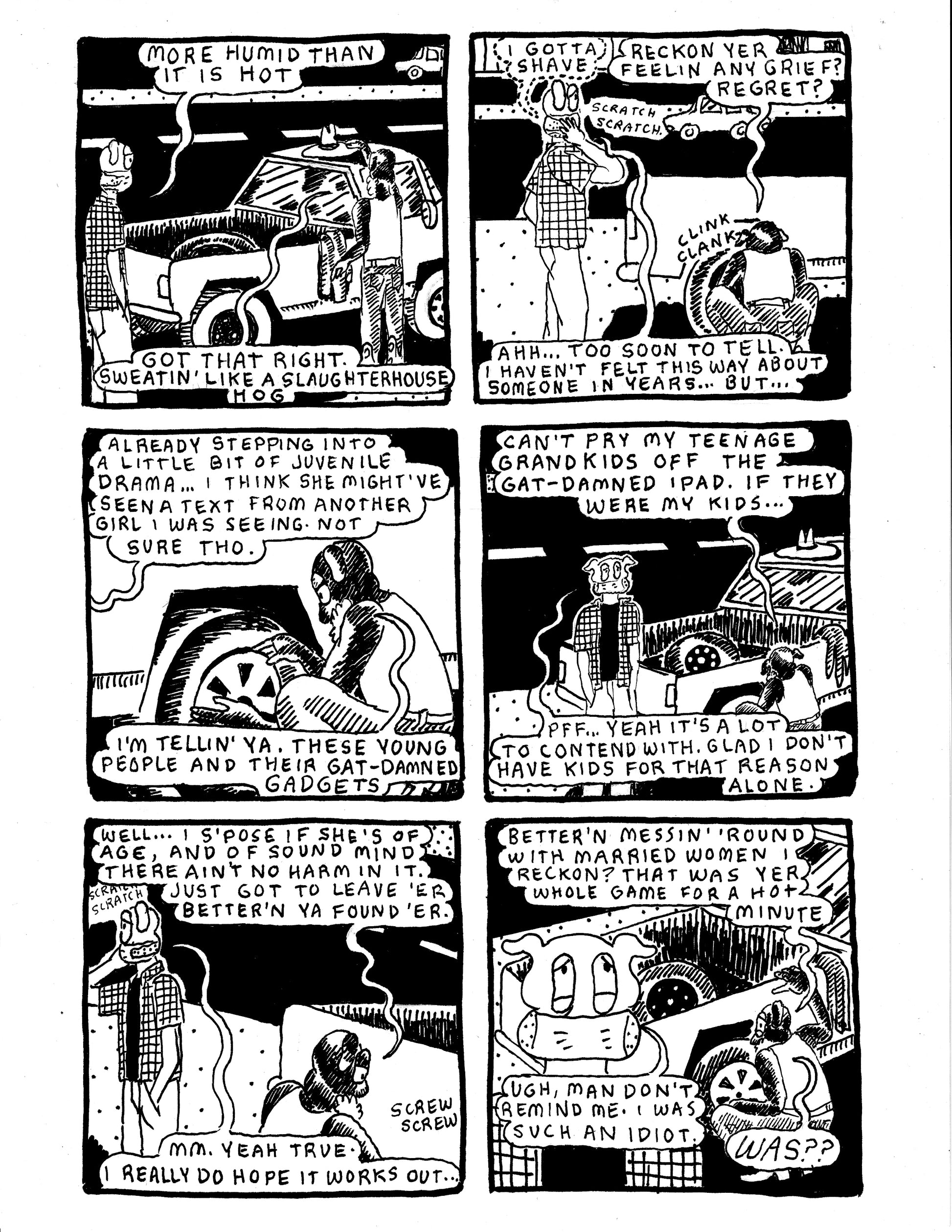 Gussy and Bullfrog converse on the side of the road while Bullfrog changes his tire